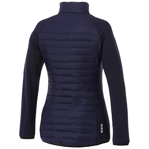The Banff women’s hybrid insulated jacket – a perfect fusion of style and performance. The inner stormflap ensures that the wind does not come through the jacket, and the dropped back hem adds an extra touch of coverage for added warmth. The elasticated binding in a contrasting colour adds a stylish accent while ensuring a secure fit. The jacket’s dull cire 380T woven fabric has a water repellent and downproof finish, made of nylon (38 g/m2). The contrast fabric is an interlock knit made of polyester and elastane (245 g/m2), adding flexibility and comfort. The fake down insulation of polyester provides lightweight warmth, perfect for chilly days. This jacket is designed with a fitted shape for a feminine look.