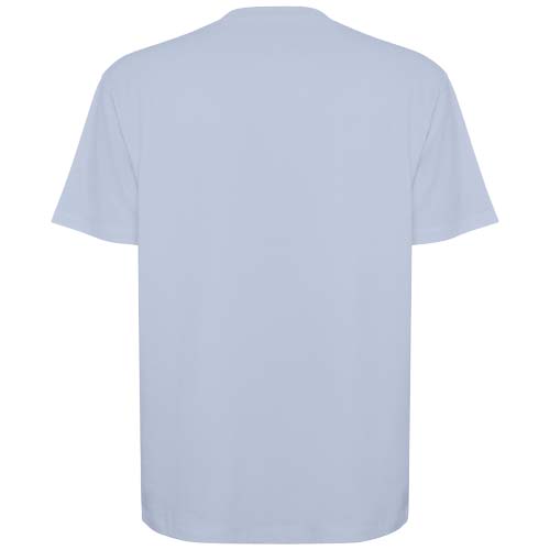 Oversized short sleeve t-shirt. Round collar trimmed in 2×1 rib with matching seam covers. Side seams. Wide double stitching on the sleeves and hem. Removable label.