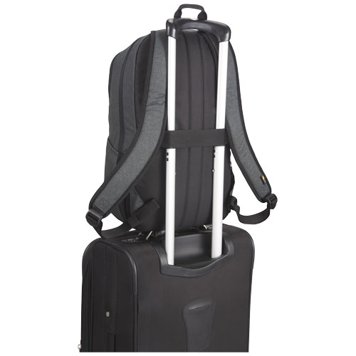 A professional laptop backpack, perfect for those who like to balance comfort and style. The spacious main compartment features thickly padded storage for a laptop up to 15″ and a dedicated slip pocket for a 10.5″ tablet. There is an additional compartment for power brick storage as well as a quick access front pocket for small electronics. Two side pockets give easy access to water bottles or go-to items. The back luggage strap securely attaches the bag to most rolling luggage. Heathered material, copper touch points, and trim details create a modern professional look.