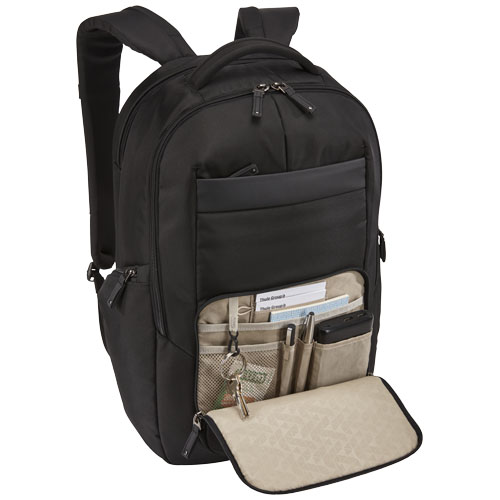 Features a large zippered main compartment with a padded 15.6″ laptop and 10.1″ tablet sleeve and a zippered mesh pocket for cables and accessories. Comes with a front organization panel to storage small electronics, cables, accessories, business cards and keys. Contains expandable side pockets for water bottle or power brick, padded shoulder straps, quilted air mesh back panel, soft handle and trolley tunnel. Case Logic warranty: 25 years.