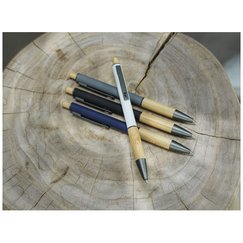 The Darius ballpoint pen is made from recycled aluminium, which requires less energy than producing aluminium from raw materials. It also reduces the amount of waste in landfills and helps to conserve natural resources aiming to reduce greenhouse emissions. The push button and the bottom part of the barrel is made of bamboo. Ink colour: Blue. Writing length: 800 metres. Nib size: 1.00 mm.