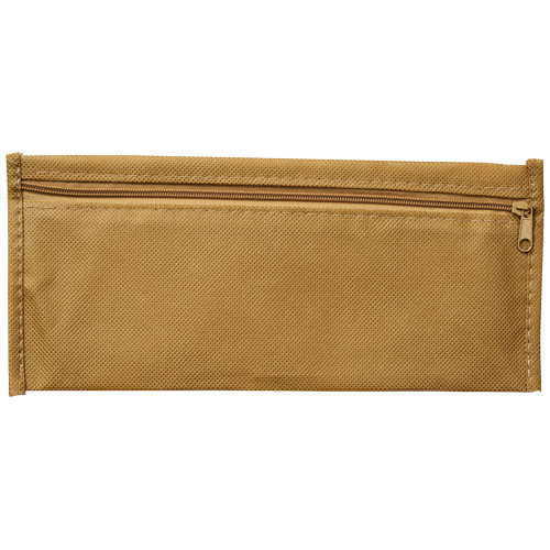Pencil case with ballpoint pen, pencil, ruler, pencil sharpener, and notepad.