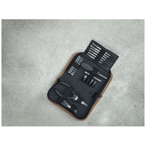 The Spike tool set combines practicality, durability and sustainability in one beautiful package. Its cork storage pouch is not only visually appealing, but also environmentally responsible without compromising on quality or performance. Inside the pouch, you’ll find a set of 24 essential tools crafted from carbon steel and RCS certified recycled plastic: 1 knife for clean cuts and precise trimming, 6 precision screwdrivers for delicate tasks, 10 screwdriver bits, 1 screwdriver handle with comfortable grip, 1 extension bar for hard-to-reach areas, 4 sockets for various applications, and 1 long nose plier for gripping and bending. Since cork is a natural product, there may be slight variations in colour and size per item, which may affect the final printing outcome. Packed in a STAC gift box from sustainable sources.