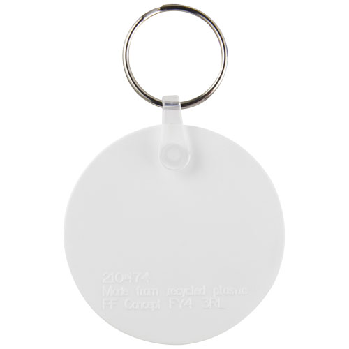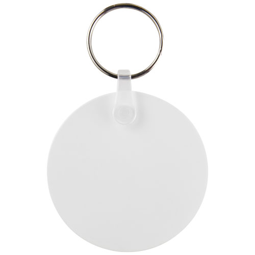 White circle-shaped keychain with metal split keyring. The metal looped ring offers a flat profile which is ideal for mailings.