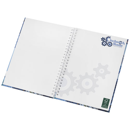 Includes 80 sheets (80g/m2) blank paper, and a black or white wire. Available in 3 sizes, A4, A5 and A6. Full colour decoration available on the cover and on each sheet, front- and back side.
